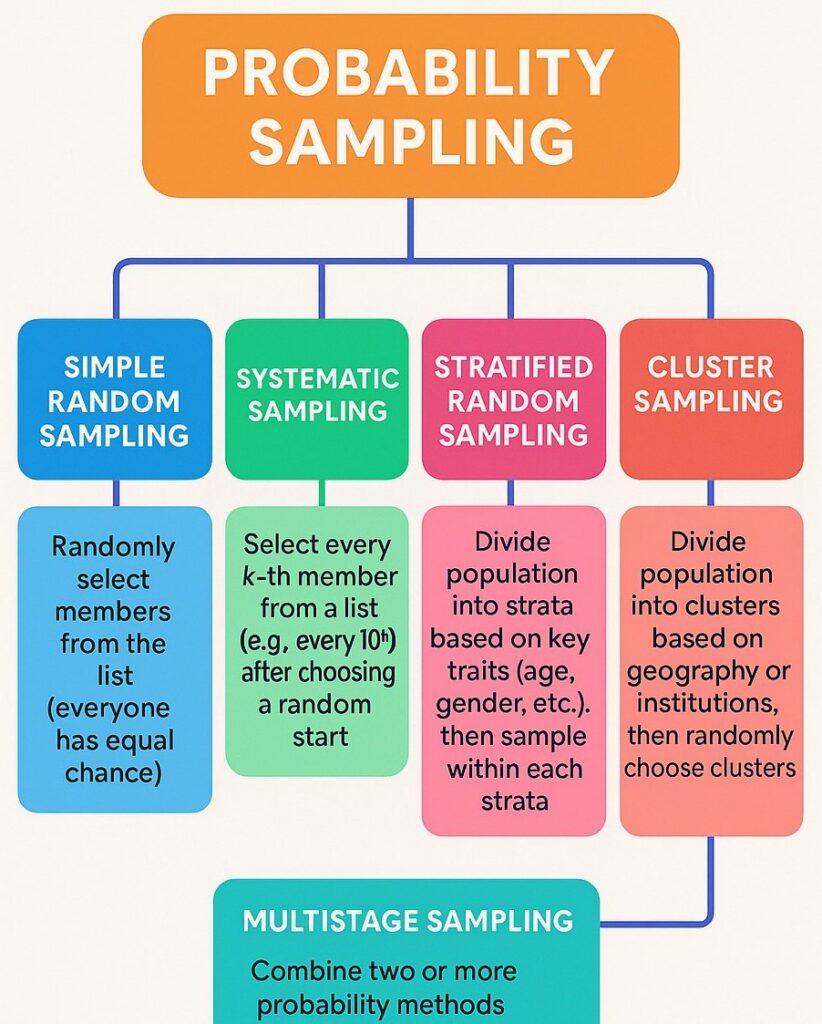 Sampling is one of the most essential steps in any research process. Whether the goal is to understand public opinion, analyse the effectiveness of a medical treatment, or study consumer behaviour, selecting the right sample is central to producing reliable and generalisable results. Probability sampling stands out as one of the most robust approaches available to researchers because it provides every member of the population a known, non-zero chance of being selected.