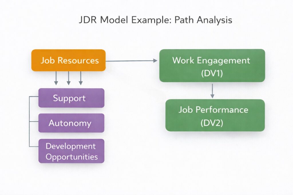 The above diagram presents the Job Demands–Resources (JDR) Model in a simplified path analysis structure, where Job Resources function as the independent variable and influence employee outcomes exclusively through Work Engagement. Job Resources, represented through key sub-dimensions such as support, autonomy, and development opportunities, enhance employees’ motivational state by fostering higher levels of work engagement. Work Engagement (DV1), characterised by vigour, dedication, and absorption in work, serves as a central mediating mechanism in the model. Increased engagement subsequently leads to improved Job Performance (DV2), indicating that employees who are more engaged are more likely to perform their roles effectively. This model underscores the theoretical premise of the JDR framework that motivational processes play a critical role in translating workplace resources into performance outcomes.