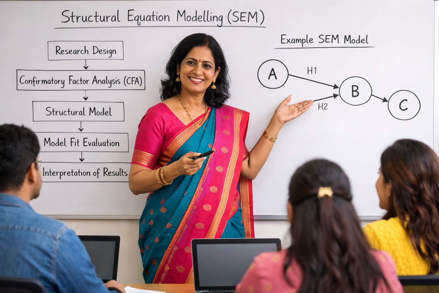 Structural Equation Modelling (SEM) has emerged as a rigorous and theory-driven methodological approach that addresses these limitations. SEM integrates measurement theory with causal modelling, enabling researchers to empirically test comprehensive theoretical frameworks. As a methodological tool, SEM strengthens research design, enhances construct validity, and supports robust hypothesis testing. This blog discusses the role of SEM from a research methodology perspective, highlighting its conceptual foundations, analytical stages, and applications across disciplines.